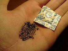 When an oxygen absorber is removed from its protective packaging, the moisture in the surrounding atmosphere begins to permeate into the iron particles inside of the absorber sachet. Moisture activates the iron, and it oxidizes to form iron oxide. Typically, there must be at least 65% relative humidity in the surrounding atmosphere before the rusting process can begin. To assist in the process of oxidation, sodium chloride is added to the mixture, acting as a catalyst or activator, causing the iron powder to be able to oxidize even with relatively low humidity. As oxygen is consumed to form iron oxide the level of oxygen in the surrounding atmosphere is reduced. Absorber technology of this type may reduce the oxygen level in the surrounding atmosphere to below 0.01%.[2][3] Complete oxidation of 1 g of iron can remove 300 cm3 of oxygen in standard conditions. Though other technologies can remove more, iron is the most useful as it does not cause odor like sulfur compounds or passivate like aluminium compounds. Many other alternatives are not food safe.[7] The moisture requirement of iron-based scavengers makes them ineffective in moisture sensitive applications.