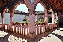 Facing the main plaza is the Palace of Huitziméngari. This structure, like most of the rest of the town, is made of adobe and has a clay tile roof.[6] This palace belonged to Antonio de Huitziméngari, the son of the last Tarascan cazonci (monarch), and the godson of the first viceroy of New Spain, Antonio de Mendoza.[12] It has two floors, a sober facade and the inner courtyard is surrounded with round arches and filled with flowers.[7][12] On the upper floor, there is a statue of a dog, an allusion to Huitziméngari's name which in Tarascan mythology referred to the dog that served the Lord of Paradise. The dog motif is repeated on some of the inside doors.[6]