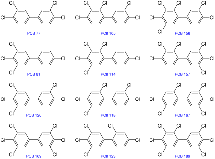 - The coplanar group members have a fairly rigid structure, with their two phenyl rings in the same plane. It renders their structure similar to polychlorinated dibenzo-p-dioxins (PCDDs) and polychlorinated dibenzofurans, and allows them to act like PCDDs, as an agonist of the aryl hydrocarbon receptor (AhR) in organisms. They are considered as contributors to overall dioxin toxicity, and the term dioxins and dioxin-like compounds is often used interchangeably when the environmental and toxic impact of these compounds is considered.[14][15]