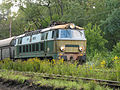 Despite of its ET designation (marking a freight locomotive) ET22 is a universal locomotive, and it is occasionally seen in passenger traffic.[2] Its maximum continuous power is 3,000 kW (4,000 hp) and it is the biggest single-box Co-Co locomotive in PKP service. Technical features enable this engine to pull heavy freight trains of up to 3150 t with a speed of 70 km/h.[1] Trains of up to 2700 t can be hauled at 80 km/h. When used as passenger locomotive it can pull trains weighing up to 700 t at 125 km/h.[6] This is caused by several features and solutions based on passenger EU07 and EU06 locomotives. Four EE-451A engines are isolated in H class with maximum temperature allowed of 180 °C. They have four main and four commutative poles.[1] Because of its length and the wheelbase between axles ET22 locomotive performs poorly on tight curves, unlike the older ET21 locomotives, despite the fact that the designers were given the same parameters for minimum curve diameter. Using the ET22 at winding tracks can cause severe damage both to rails and locomotive bogies. This forced several modifications, which are made presently. Such changes are essential, as fewer and fewer ET21 locomotives are in service and ET41 are ineffective on highland tracks due to being overpowered (highland trains length is limited by short station tracks).[3] The locomotives were originally painted in two shades of green, with grey roofs. In the 1980s and 1990s their ends were painted yellow for better visibility, but during further repairs an original, the more aesthetic old scheme was being restored, or only a narrow yellow stripe was retained.