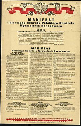The Manifesto of the Polish Committee of National Liberation (PKWN) known as July or PKWN Manifesto (Polish: Manifest PKWN, Manifest lipcowy) was a political manifesto of the Polish Committee of National Liberation, a Soviet-backed administration, which operated in opposition to the London-based Polish government in exile.