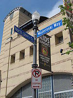 Statues of Pirates' Hall of Famers Honus Wagner, Roberto Clemente, Willie Stargell and Bill Mazeroski are positioned at various points outside of PNC Park. Wagner and Clemente's statues were previously located outside of Three Rivers Stadium, and after the venue was imploded, the two statues were removed from their locations, refurbished, and relocated outside PNC Park.[40] Wagner's statue was originally unveiled at Forbes Field in 1955.[41][42] The base of Clemente's statue is shaped like a baseball diamond, with dirt from three of the fields Clemente played at—Santurce Field in Carolina, Puerto Rico, Forbes Field, and Three Rivers Stadium—at each base.[43] On October 1, 2000, after the final game at Three Rivers Stadium, Stargell threw out the ceremonial last pitch. He was presented with a model of a statue that was to be erected in his honor outside of PNC Park.[44] The statue was officially unveiled on April 7, 2001; however, Stargell did not attend due to health problems and died of a stroke two days later.[45][46] A statue for Bill Mazeroski was added at the right field entrance, at the south end of Mazeroski Way, during the 2010 season. This was the 50th anniversary of the Pirates' 1960 World Series championship, which Mazeroski clinched with a Game 7 walk-off home run at Forbes Field. The statue itself was designed based on that event.[47]