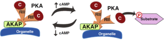Inactive PKA holoenzyme exists as a tetramer composed of two regulatory (R) subunits and two catalytic (C) subunits.[15] Biochemical studies demonstrated that there are two types of R subunits. The type I R subunits of which there are two isoforms (RIα, and RIβ) bind the catalytic subunits to create the type I PKA holoenzyme. Likewise type II R subunits, of which there are two isoforms (RIIα, and RIIβ), create the type II PKA holoenzyme. In the presence of cAMP, each R subunit binds 2 cAMP molecules and causes a conformational change in the R subunits that releases the C subunits to phosphorylate downstream substrates.[16] The different R subunits differ in their sensitivity to cAMP, expression levels and subcellular locations. A-kinase-anchoring proteins (AKAPs) bind a surface formed between both R subunits and target the kinase to different locations in the cell. This optimizes where and when cellular communication occurs within the cell.[11]