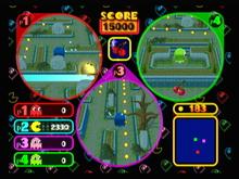 The objective of all players is to be the first to reach the predetermined score. Pac-Man can earn points by eating pellets, vulnerable ghosts and fruit, while ghosts can earn them by eating fruit and catching Pac-Man. Should Pac-Man clear the stage of pellets, the person controlling him will earn 1,600 point bonus and will continue to play as him in the next stage, however Pac-Man will also lose that same amount if a ghost catches him, being given to whoever caught him. Mario appears as an announcer and will commentate on the game, such as when Pac-Man eats a Power Pellet or when a fruit appears in the stage. Six different mazes can be selected, each having different layouts and music.