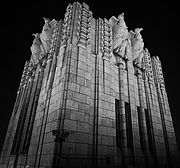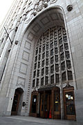 Statues of eight eagles (each 13 feet (4.0 m) in height) perch atop the tower's crown.[17][18] The building has an L—shaped floor plan, and the architecture decoratively incorporates spotlights to show the exterior's terra cotta ornamentation day and night.[13]