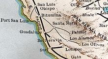 The Santa Maria Valley of the central California coast was isolated by the Santa Lucia Range to the north and the Santa Inez Range to the south. El Camino Real traversed the difficult La Cuesta pass to reach San Francisco via the Salinas Valley or San Marcos pass to reach Los Angeles via Santa Barbara. The 1,800-foot (550 m) People's Wharf was built at Port Harford in 1869 to transfer freight and passengers from Pacific Coast Steamships Mohongo, Orizaba and Gypsy operating between San Francisco and San Diego. Goodall, Nelson and Perkins steamships Ventura and Constantine began weekly service to Port Harford in 1873; and Ah Louis built a horse-powered, 2 ft 6 in (762 mm) narrow gauge tramway in 1873 to transport passengers and freight between Port Harford and a wagon road at Avila Beach.[2]
