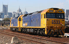 A pair of G class locomotives in Melbourne in February 2007 Freight Australia liveried X class at Grovedale, Victoria in April 2007 Triple-header 92 class coal train crossing the Hunter River at Singleton in April 2012 PN002 at Downer Rail, Maryborough in November 2004 PN004 at Stuart depot, Townsville in August 2006. Freight Australia liveried A class in Melbourne in February 2007