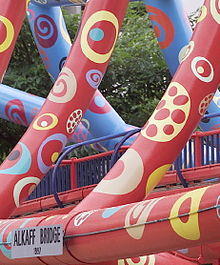Abad created over 4,500 artworks in her career.[3] Her early paintings were primarily figurative socio-political works of people and primitive masks. Another series was large scale paintings of underwater scenes, tropical flowers, and animal wildlife. Pacita's most extensive body of work, however, is her vibrant, colorful abstract work - many very large scale canvases, but also a number of small collages - on a range of materials from canvas and paper to bark cloth, metal, ceramics, and glass. She painted the 55-meter long Alkaff Bridge in Singapore and covered it with 2,350 multicolored circles, just a few months before she died.