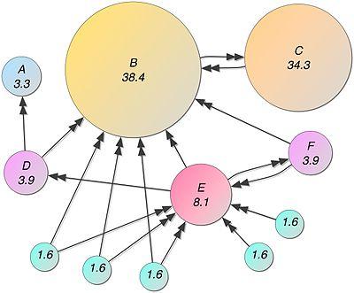 Suppose instead that page B had a link to pages C and A, page C had a link to page A, and page D had links to all three pages. Thus, upon the first iteration, page B would transfer half of its existing value, or 0.125, to page A and the other half, or 0.125, to page C. Page C would transfer all of its existing value, 0.25, to the only page it links to, A. Since D had three outbound links, it would transfer one third of its existing value, or approximately 0.083, to A. At the completion of this iteration, page A will have a PageRank of approximately 0.458.