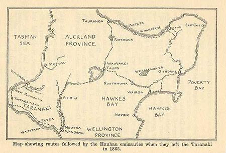 The reverses at Sentry Hill and Moutoa Island reinforced Māori belief in Te Ua's movement, with the conviction that the defeats had been caused by disobedience to the leader by the prophets Hepanaia and Matene. More iwi attached themselves to Te Ua. In early 1865 emissaries carrying the smoke-dried severed heads[11] were sent from Taranaki to chief Hirini Te Kani at Poverty Bay via Wanganui and Taupo in two parties – one via Rotorua, Whakatane, Opotiki, and East Cape, and the other through the centre of the island via Ruatahuna and Wairoa.