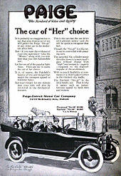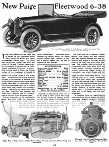 Paige first began producing automobiles in 1908. The company's first car was a two-seat model powered by a 2.2-liter three-cylinder, two-stroke engine.[1] This model continued until 1910, when a four-stroke, four-cylinder engine design took over.[1] In 1911, the company's namesake was shortened to Paige. A six-cylinder model was added to the range in 1914. Four-cylinder models were dropped in 1916, leaving a choice of 3.7- or 4.9-liter sixes. Another name change occurred in 1919, when models fitted with a Duesenberg engine were known as Paige-Linwood, and models fitted with a Continental engine were listed as Paige-Larchmont. A straight-eight engine was added to the sixes in 1927.