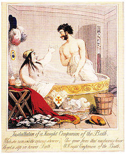 The prosecution case, led by the Attorney General for England and Wales Sir Robert Gifford, began on Saturday 19 August. The Queen did not attend. Gifford claimed that Caroline and Pergami had lived as lovers for five years from November 1814. He asserted that they shared a bedroom, were seen in each other's presence arm-in-arm, and were heard kissing. The Queen, he stated, changed clothes in front of Pergami and ate her meals with him. He said that Pergami was a married man, but although his child, sister, mother and brother lived in the Queen's household, his wife did not.[24] The Sunday newspapers the following morning were filled with the salacious details of Gifford's speech.[25] Gifford resumed his attack on Monday 21 August by recounting further outrageous revelations: Pergami and Caroline had been seen together on a bed in a state of undress; she had sat on Pergami's knee in public; she had taken baths accompanied only by Pergami.[26] High society did not receive the speech well. They were appalled at Caroline's behaviour, but they were more appalled at George's. By forcing the details of Caroline's life into the public arena, George had damaged the monarchy and endangered the political status quo.[27] Leigh Hunt wrote to Percy Bysshe Shelley, "The whole thing will be one of the greatest pushes given to the declining royalty that the age has seen."[28]