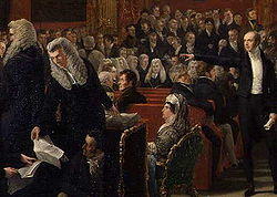 On 17 August 1820, the trial opened. Amid a large military presence, crowds gathered to watch the peers and the Queen attend Parliament.[19] Once in their chamber, the Lords began the bill's second reading (the first reading was a formality). Lord Chancellor Lord Eldon, acting as the Speaker of the House, noted the absence of several peers, notably Lords Byron and Erskine, because they were either abroad or too elderly to attend. Caroline's brother-in-law, Prince Augustus, Duke of Sussex, asked to be excused from participating on the grounds of consanguinity. His request was granted, though his brother, Prince Frederick, Duke of York, announced that he would continue to attend.[20]