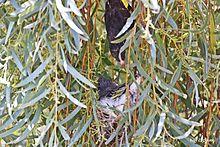 Height of nests in trees can vary from a couple of metres off the ground to over 15 metres high.[18] They are usually built in the drooping foliage of a eucalypt or other suitable tree species, or they are made within the structure of a mistletoe plant.[18]