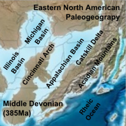 - ^ a b Königshof, P. (2009). "Devonian change: case studies in palaeogeography and palaeoecology - an introduction". Geological Society, London, Special Publications. 314 (1): 1–6. Bibcode:2009GSLSP.314....1K. doi:10.1144/SP314.1. ISSN 0305-8719.