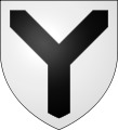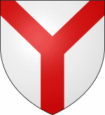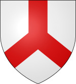 If there is symmetry within the arms, its blazon can be simplified in the English language by use of the heraldic term 'between' -- 'in the midst of, so as to make a symmetrical composition'.[1] The coat of Saint-Wandrille-Rançon is an example where the French blasonnement is similar to the traditional English blazon, yet can be described with a simplified English blazon.