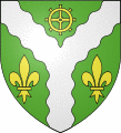 Vert, a pall wavy Argent accompanied in chief by one mill wheel Or and flanked by two fleurs-de-lys of the same.