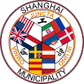 Vert a pall wavy Argent between one mill wheel and two fleurs-de-lys Or.[2]Seal of Shanghai Municipal Council, Shanghai International Settlement