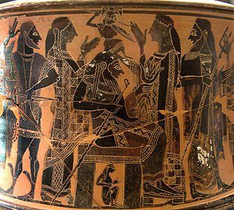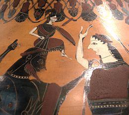 In Books V–VI of the Iliad, Athena aids the hero Diomedes, who, in the absence of Achilles, proves himself to be the most effective Greek warrior.[192][139] Several artistic representations from the early sixth century BC may show Athena and Diomedes,[192] including an early sixth-century BC shield band depicting Athena and an unidentified warrior riding on a chariot, a vase painting of a warrior with his charioteer facing Athena, and an inscribed clay plaque showing Diomedes and Athena riding in a chariot.[192] Numerous passages in the Iliad also mention Athena having previously served as the patron of Diomedes's father Tydeus.[193][194] When the Trojan women go to the temple of Athena on the Acropolis to plead her for protection from Diomedes, Athena ignores them.[115]