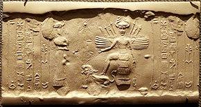It is generally agreed that the cult of Athena preserves some aspects of the Proto-Indo-European transfunctional goddess.[28][29] The cult of Athena may have also been influenced by those of Near Eastern warrior goddesses such as the East Semitic Ishtar and the Ugaritic Anat,[11] both of whom were often portrayed bearing arms.[13] Classical scholar Charles Penglase notes that Athena resembles Inanna in her role as a "terrifying warrior goddess"[30] and that both goddesses were closely linked with creation.[30] Athena's birth from the head of Zeus may be derived from the earlier Sumerian myth of Inanna's descent into and return from the Underworld.[31][32]