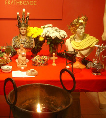 In her aspect of Athena Polias, Athena was venerated as the goddess of the city and the protectress of the citadel.[13][40][41] In Athens, the Plynteria, or "Feast of the Bath", was observed every year at the end of the month of Thargelion.[42] The festival lasted for five days. During this period, the priestesses of Athena, or plyntrídes, performed a cleansing ritual within the Erechtheion, a sanctuary devoted to Athena and Poseidon.[43] Here Athena's statue was undressed, her clothes washed, and body purified.[43] Athena was worshipped at festivals such as Chalceia as Athena Ergane,[44][41] the patroness of various crafts, especially weaving.[44][41] She was also the patron of metalworkers and was believed to aid in the forging of armor and weapons.[44] During the late fifth century BC, the role of goddess of philosophy became a major aspect of Athena's cult.[45]