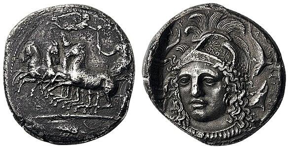 Athena portrait by Eukleidas on a tetradrachm from Syracuse, Sicily c. 400 BC
