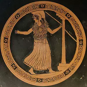 In Book XXII of the Iliad, while Achilles is chasing Hector around the walls of Troy, Athena appears to Hector disguised as his brother Deiphobus[195] and persuades him to hold his ground so that they can fight Achilles together.[195] Then, Hector throws his spear at Achilles and misses, expecting Deiphobus to hand him another,[196] but Athena disappears instead, leaving Hector to face Achilles alone without his spear.[196] In Sophocles's tragedy Ajax, she punishes Odysseus's rival Ajax the Great, driving him insane and causing him to massacre the Achaeans' cattle, thinking that he is slaughtering the Achaeans themselves.[197] Even after Odysseus himself expresses pity for Ajax,[198] Athena declares, "To laugh at your enemies - what sweeter laughter can there be than that?" (lines 78–9).[198] Ajax later commits suicide as a result of his humiliation.[198]