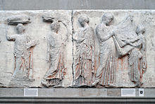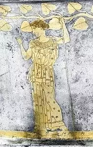 A Mycenean fresco depicts two women extending their hands towards a central figure, who is covered by an enormous figure-eight shield; this may depict the warrior-goddess with her palladion, or her palladion in an aniconic representation.[22][23] In the "Procession Fresco" at Knossos, which was reconstructed by the Mycenaeans, two rows of figures carrying vessels seem to meet in front of a central figure, which is probably the Minoan precursor to Athena.[24] The early twentieth-century scholar Martin Persson Nilsson argued that the Minoan snake goddess figurines are early representations of Athena.[12][13]