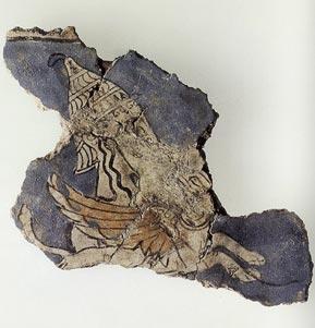 Restoration of the polychrome decoration of the Athena statue from the Aphaea temple at Aegina, c. 490 BC (from the exposition "Bunte Götter" by the Munich Glyptothek)