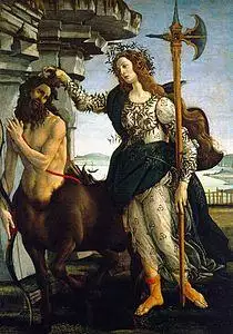 During the Renaissance, Athena donned the mantle of patron of the arts and human endeavor;[210] allegorical paintings involving Athena were a favorite of the Italian Renaissance painters.[210] In Sandro Botticelli's painting Pallas and the Centaur, probably painted sometime in the 1480s, Athena is the personification of chastity, who is shown grasping the forelock of a centaur, who represents lust.[211][212] Andrea Mantegna's 1502 painting Minerva Expelling the Vices from the Garden of Virtue uses Athena as the personification of Graeco-Roman learning chasing the vices of medievalism from the garden of modern scholarship.[213][212][214] Athena is also used as the personification of wisdom in Bartholomeus Spranger's 1591 painting The Triumph of Wisdom or Minerva Victorious over Ignorance.[204]