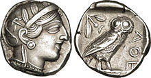 In Homer's epic works, Athena's most common epithet is Glaukopis (γλαυκῶπις), which usually is translated as, "bright-eyed" or "with gleaming eyes".[74] The word is a combination of glaukós (γλαυκός, meaning "gleaming, silvery", and later, "bluish-green" or "gray")[75] and ṓps (ὤψ, "eye, face").[76] The word glaúx (γλαύξ,[77] "little owl")[78] is from the same root, presumably according to some, because of the bird's own distinctive eyes. Athena was clearly associated with the owl from very early on;[79] in archaic images, she is frequently depicted with an owl perched on her hand.[79] Through its association with Athena, the owl evolved into the national mascot of the Athenians and eventually became a symbol of wisdom.[5]