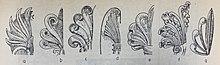 As an ornamental motif found in classical architecture, the palmette and anthemion[14] take many and varied forms.[15] Typically, the upper part of the motif consists of five or more leaves or petals fanning rhythmically upwards from a single triangular or lozenge-shaped source at the base. In some instances fruits resembling palm fruits hang down on either side above the base and below the lowest leaves. The lower part consists of a symmetrical pair of elegant 'S' scrolls or volutes curling out sideways and downwards from the base of the leaves. The upper part recalls the thrusting growth of leaves and flowers, while the volutes of the lower part seem to suggest both contributing fertile energies and resulting fruits. It is often present on the necking of the capital of Ionic order columns; however in column capitals of the Corinthian order it takes the shape of a 'fleuron' or flower resting against the abacus (top-most slab) of the capital and springing out from a pair of volutes which, in some versions, give rise to the elaborate volutes and acanthus ornament of the capital.