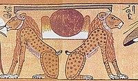 It is thought that the palmette originated in ancient Egypt 2,500 years BC,[4] and has influenced Greek art. Egyptian palmettes (Greek anthemia) were originally based on features of various flowers, including the papyrus and the lotus or lily representing lower and upper Egypt and their fertile union, before it became associated with the palm tree. From earliest times there was a strong association with the sun and it is probably an early form of the halo. Among the oldest forms of the palmette in ancient Egypt was a 'rosette' or daisy-like lotus flower[5] emerging from a 'V' of foliage or petals resembling the akhet hieroglyph depicting the setting or rising sun at the point where it touches the two mountains of the horizon – 'dying', being 'reborn' and giving life to the earth. A second form, apparently evolved from this, is a more fully developed palmette[6] similar to the forms found in Ancient Greece.