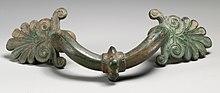 Most early Egyptian forms of the motif appear later in Crete, Mesopotamia, Assyria and Ancient Persia, including the daisy-wheel-style lotus and bud border.[11] In the form of the palmette that appears most frequently on Greek pottery,[12] often interspersed with scenes of heroic deeds, the same motif is bound within a leaf-shaped or lotus-bud shaped outer line. The outer line can be seen to have evolved from an alternating frieze of stylized lotus and palmette.[13] This anticipates the form it often took – from Renaissance sculpture through to Baroque fountains – of the inside of a half scallop shell, in which the palm fronds have become the fan of the shell and the scrolls remain at the convergence of the fan. Here the shape was associated with Venus or Neptune and was typically flanked by a pair of dolphins or became a vehicle drawn by sea-horses. Later, this circular or oval outer line became a motif in itself, forming an open C-shape with the two in-growing scrolls at its tips. Much Baroque and Rococo furniture, stucco ornament or wrought-iron work of gates and balconies is made up of ever-varying combinations these C-scrolls, either on their own, back to back, or in support of full palmettes.