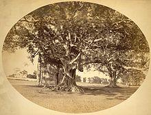 Photo taken 1875 by an unknown photographer, shows a small mosque beside a tree on the Puraria Paltan Maidan