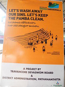 The Kerala High Court has initiated steps to control the pollution of the river from the practice of some visitors to Sabarimala who throw their clothes into it.[2] As part of the Punyam Poonkavanam project, pilgrims have been exhorted to avoid the usage of soap and oil while bathing in River Pamba. They are also requested not to throw any material, including clothes, to this holy river. At a broader level, this project aims to spread the message of cleanliness and greenness beyond Pamba and Sabarimala.[3]