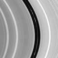 The Encke Gap contains a ringlet that is coincident with Pan's orbit, indicating that Pan maintains the particles in horseshoe orbits.[17] A second ringlet is periodically disrupted by Pan, similarly to how the F Ring is disturbed by Prometheus.[18]