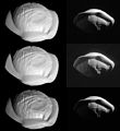 - ^ This photo of Pan was acquired by the Cassini spacecraft's narrow-angle Imaging Science Subsystem (ISS) camera on 7 March 2017. This view of the moon's northern hemisphere shows its walnut-like appearance, with a highly inclined equatorial ridge almost eclipsing the moon's southern hemisphere from view.