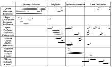 The establishment of a deposition sequence for the minerals of the Panasqueira veins is quite difficult due to the existence of different stages of formation and to the fact that some of them only appear in certain areas of the Couto Mineiro, making their correlation very difficult. However, Kelly & Rye (1979) defined, for the mineralogy of the Panasqueira veins, four stages of deposition: