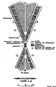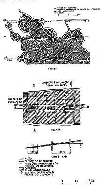 During the 50s this method was widespread throughout the mine. According to the inclination of the veins, used: parallel fronts (for sub-horizontal veins) or irregular fronts, also called "modas e bordados"(fashions and embroideries) (for veins with a slope between 7º and 12º). Wooden ore cars circulated within the stope (manual filling) that transported the ore to the bins where it dropped by gravity to the Lower Scrolling Level. Mechanical drilling was done with compressed air jacklegs and the start off was done, as today by explosives. When filling the ore cars the waste was chosen remaining as a wall that accompanied the advancement of the excavation constituting the structure responsible for the support of the cavity. This method had several drawbacks such as the requirement of a lot of labour and the loss of the finer fraction of the ore as it was violently thrown against the stone walls. The method was improved in order to find solutions for the loss of this finer fraction and consequently more mineralized.