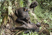 Pant-hoot chorusing in chimpanzees is a facilitative method of social bonding between males in a population and can be indicative of the level of affiliation between members in a party.[4] A social affiliation between male chimpanzees can be recognized by observable behaviours such as reciprocal grooming, non-vocal displays and the support of a member during conflicts with conspecifics.[4] The display of these behaviours between two male chimpanzees or an entire group suggest that these individuals are highly affiliated with strong social bonds.[4] The production of pant-hoots between members are also reflective upon this observation, in which individuals are more likely to engage in chorusing behaviours with their long-term affiliative social partners, as opposed to other neutral males in which they are not affiliated.[4] However, male chimpanzees have been found to occasionally chorus with neutral males in situations where their preferred social partner is unavailable, forming short-term social bonds, and essentially displaying the three behaviours indicative of social bonding; grooming, support and non-vocal displays during days when they pant-hoot chorus with these neutral males.[4] This illustrates how joint pant-hoot chorusing can facilitate the formation of social bonding activities between male chimpanzees.[4] The establishment of this bond can be indicated to each member of the party as the joint chorus and response to the initial caller illustrates the commitment and attention that the correspondant has devoted to the caller, and subsequently, the formation of the social bond between them.[4]