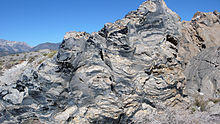 Flow banding containing both obsidian and pumice is common at Panum Crater. Another common texture, called breadcrust, can also be seen in the dome. Breadcrust textures form when the inside of a cooling rock is still hot with gas escaping from it while the outside surface has already cooled. As the gas expands from the inside, the outside surface cracks to allow the gas to escape.[4]