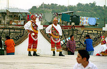 On December 7, there is a tradition called the "Dia del Niño Perdido” (Day of the Lost Child). On this day, lighted candles are placed on doorjambs and windowsills. However, the major festival for this city is the feast of Corpus Christi, which features processions, and indigenous dances such as the tocotines, guaguas, negritos, Santiagueros and voladores.[1] The first feast of Corpus Christi was celebrated in Papantla sometime between 1550 and 1560, sponsored by the encomendero of the area, Placido Perez. Until very recently, the celebration was strictly religious with processions and liturgy. In 1957, a more secular event called the Festival of Corpus Christi was added to run concurrently with the religious rites. In that year, a livestock, agriculture, industrial and cultural fair was added. In 1958, the celebration of “Juegos Florales” (flower arrangements) and the Festival Xanath began to distinguish the event from others in the area. The Xanath Festival was begun by Mariano Torres Carreño and Hector Ventura de Castro with the aim of presenting Totonac culture to the city and make the residents proud of their heritage. The festival has indigenous art exhibits, traditional dance, costumes and music. The dances are choreographed into a single spectacle which is reworked each year.[8]