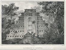 In 1785, the nearby ruins of the pre-Hispanic city of El Tajín were accidentally discovered by Spaniard Diego Ruiz, while he was looking for clandestine plantings of tobacco. This site became famous around the world soon after due to the writings of Alexander von Humboldt and others. During the Mexican War of Independence, Serafin Olarte and his guerrillas actively fought in the area from 1813 to 1820, until Olarte was captured by royalist forces and executed.[3] The municipality was created in 1880 by decree. In 1910, the settlement gained city status with the name of Papantla de Hidalgo. The official name was changed to Papantla de Olarte, in honor of Serafin Olarte.[1] As during the War of Independence, indigenous peoples of the area rebelled against the regime of Porfirio Díaz in the late 1890s, just prior to the Mexican Revolution. A number of clashes were also fought here during that war.[3]