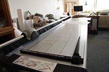 Paper cutters vary in size, usually from about 30 centimetres (1 ft) in length on each side for office work to 841 millimetres (33.1 in) (an edge of A1 paper) in design workshops. The surface will usually have a grid either painted or inscribed on it, often in half-inch increments, and may have a ruler across the top. At the very least, it must have a flat edge against which the user may line up the paper at right-angles before passing it under the blade. It is usually relatively heavy, so that it will remain steady while in use.