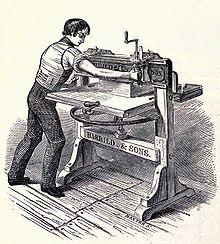 Paper cutters, similar to those of today, were patented in 1844 and 1852 by Guillaume Massiquot. They have been around since the late 1830s, when, in 1837, Thirault built a model with a fixed blade to a flat surface. Since the middle of the 19th century, considerable improvements have been made by Fomm and Krause of Germany, Furnival in England, and Oswego and Seybold in the United States.[1]