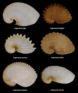 The genus Argonauta contains up to seven extant species. Several extinct species are also known.