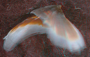 Female argonauts produce a laterally-compressed calcareous eggcase in which they reside. This "shell" has a double keel fringed by two rows of alternating tubercles. The sides are ribbed with the centre either flat or having winged protrusions. The eggcase curiously resembles the shells of extinct ammonites. It is secreted by the tips of the female's two greatly expanded dorsal tentacles (third left arms) before egg laying. After she deposits her eggs in the floating eggcase, the female takes shelter in it, often retaining the male's detached hectocotylus. She is usually found with her head and tentacles protruding from the opening, but she retreats deeper inside if disturbed. These ornate curved white eggcases are occasionally found floating on the sea, sometimes with the female argonaut clinging to it. It is not made of aragonite as most other shells are, but of calcite, with a three-layered structure[7] and a higher proportion of magnesium carbonate (7%) than other cephalopod shells.[8]
