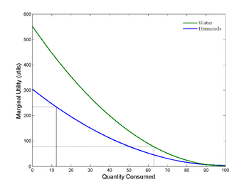 The paradox of value (also known as the diamond–water paradox) is the contradiction that, although water is on the whole more useful, in terms of survival, than diamonds, diamonds command a higher price in the market. The philosopher Adam Smith is often considered to be the classic presenter of this paradox, although it had already appeared as early as Plato's Euthydemus.[1] Nicolaus Copernicus,[2] John Locke, John Law[3] and others had previously tried to explain the disparity.