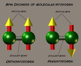 Molecular hydrogen occurs in two isomeric forms, one with its two proton nuclear spins aligned parallel (orthohydrogen), the other with its two proton spins aligned antiparallel (parahydrogen).[1] These two forms are often referred to as spin isomers.[2]